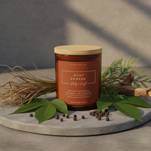 The Root Chakra Candle by Laritelle is designed to anchor your energy and restore a sense of deep inner steadiness. This luxury blend opens with earthy vetiver and cedarwood, softened by patchouli and warmed with black pepper, creating a serene, stabilizing atmosphere that reconnects you to your foundation.
